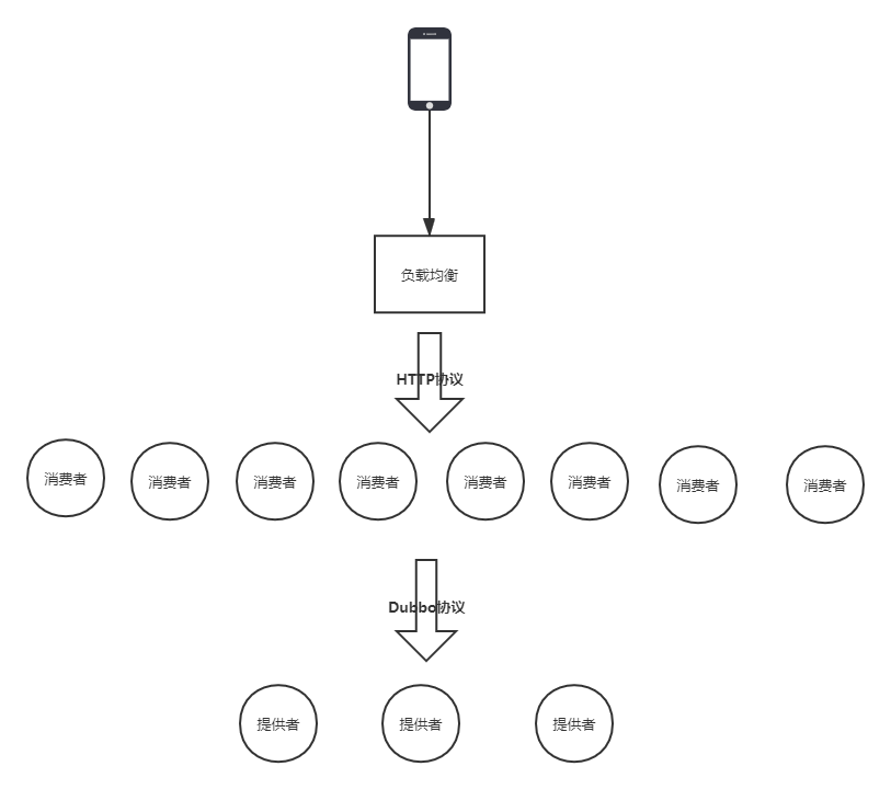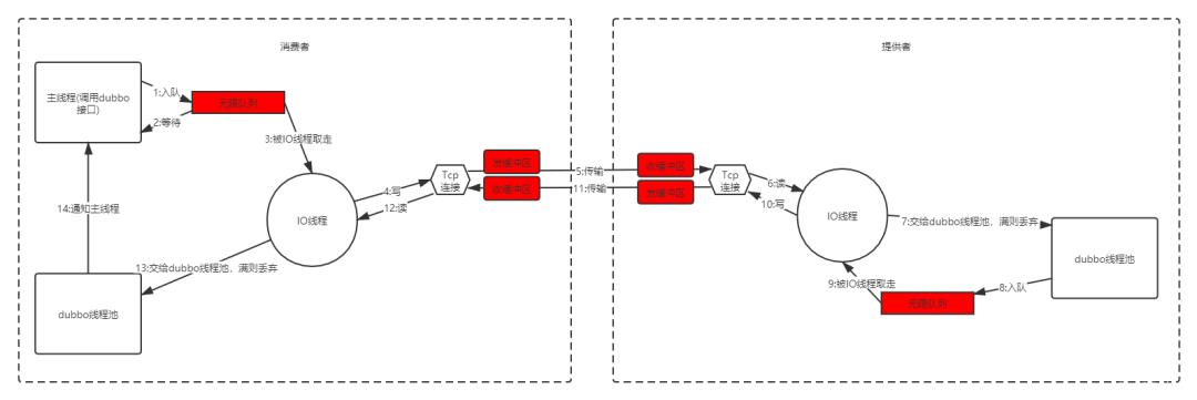 近期在一次生产发布过程中,因为突发的流量,出现了拥堵。系统的部署图如下,客户端通过Http协议访问到Dubbo的消费者,消费者通过Dubbo协议访问服务提供者。这是单个机房,8个消费者3个提供者,共两个机房对外服务。
