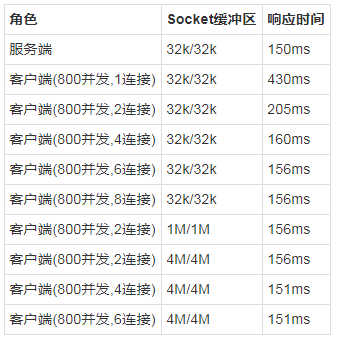 服务端的纯业务函数响应时间很稳定,在缓冲区较小的时候,调大连接数虽然能让时间降下来,但是并不能到最优,所以缓冲区不能设置太小,Linux一般默认是4M,在4M的时候,4个连接基本上已经能把响应时间降到最低了。