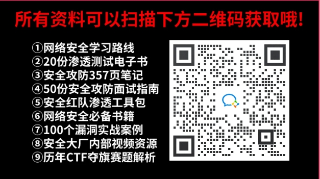 为了帮助大家更好的学习网络安全,小编给大家准备了一份网络安全入门/进阶学习资料,里面的内容都是适合零基础小白的笔记和资料,不懂编程也能听懂、看懂,所有资料共282G,朋友们如果有需要全套网络安全入门+进阶学习资源包,可以点击免费领取(如遇扫码问题,可以在评论区留言领取哦)~
