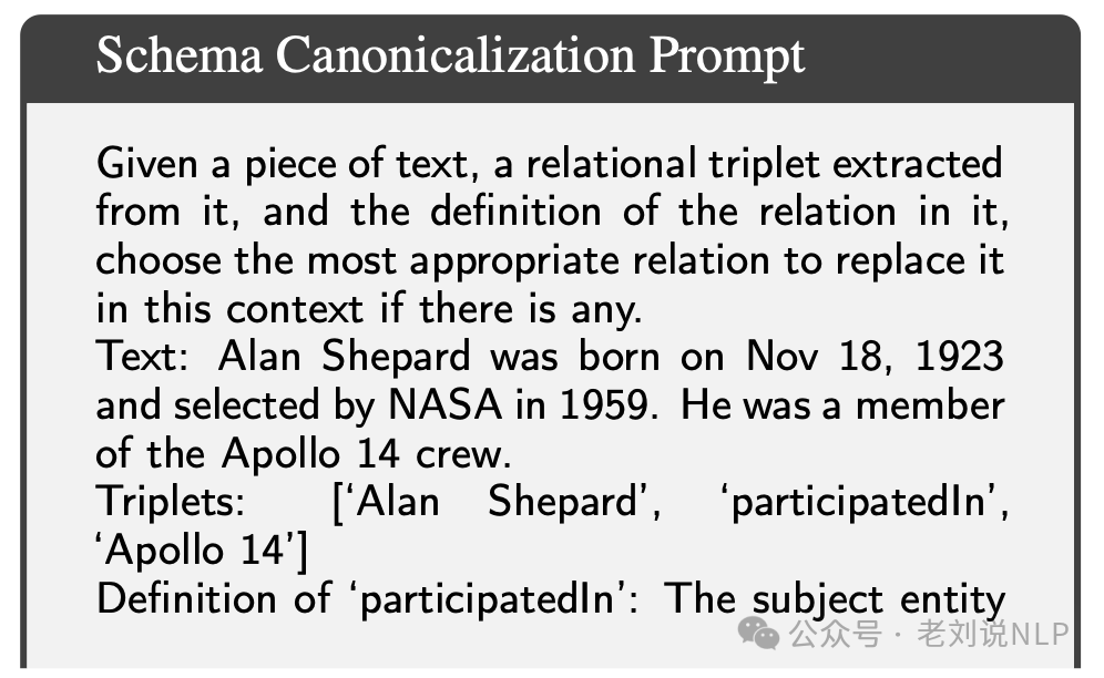 例如,给定文本“Alan Shepard was born on Nov 18, 1923 and selected by NASA in 1959. He was a member of the Apollo 14 crew”,LLMs会提取出三元组[‘Alan Shepard’, ‘bornOn’, ‘Nov 18, 1923’]和[‘Alan Shepard’, ‘participatedIn’, ‘Apollo 14’]。