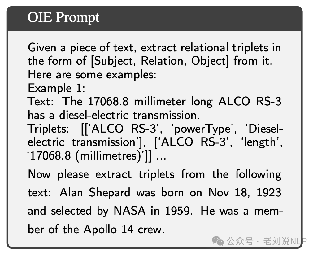利用大模型进行少量样本提示(few-shot prompting),从输入文本中识别并提取关系三元组([Subject, Relation, Object]),这个过程不依赖于任何特定的模式(schema)。