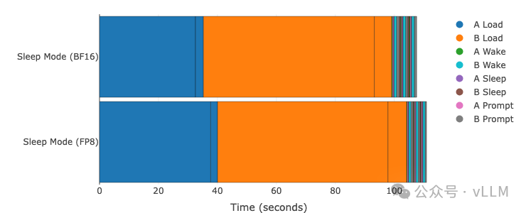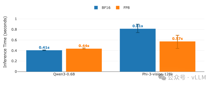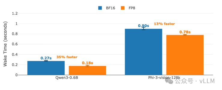 模型A: Qwen3-0.6B | 模型B: Phi-3-vision-128k-instruct GPU: A100 (TP=1) | vLLM 0.11.0 | 睡眠级别:1 | 编译模式:cudagraph_mode: FULL_AND_PIECEWISE对比BF16(基线)vs FP8量化。悬停查看精确时间。