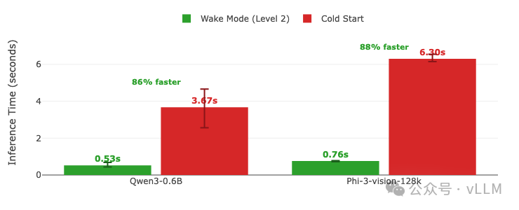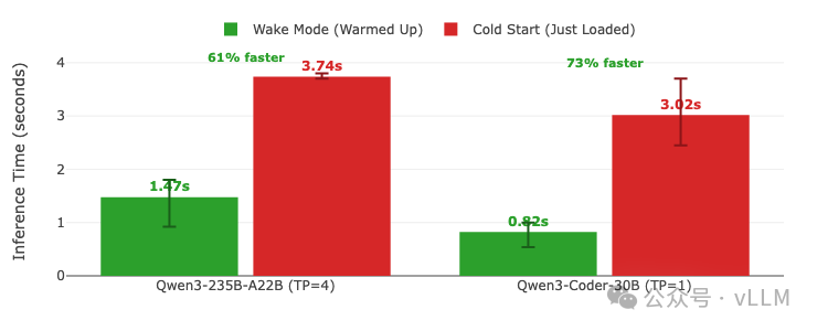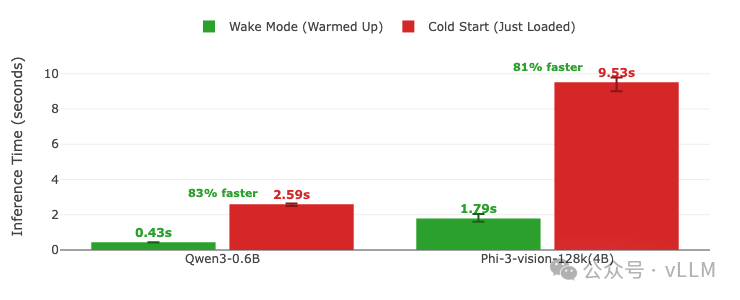 推理时间对比显示唤醒模式(已预热)与冷启动(刚加载)的差异。 推理时间 = 预填充 + 解码(唤醒/加载后的首次请求)。每个请求使用不同问题以避免缓存,输出限制为100个token。 误差棒显示多次运行中的最小/最大变化。数值直接标注在柱形图上。 GPU:A100 | vLLM 0.11.0 | 休眠等级:1 | 编译:cudagraph_mode: FULL_AND_PIECEWISE