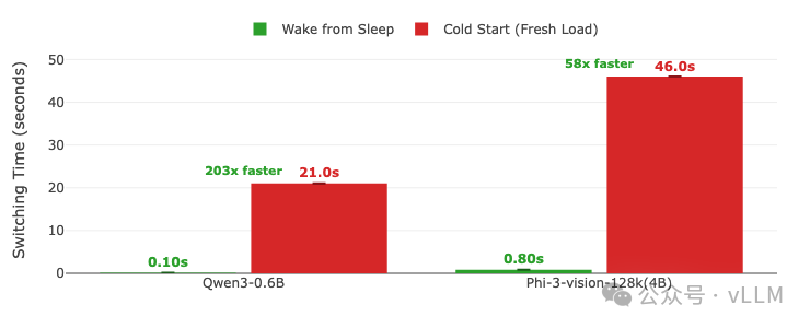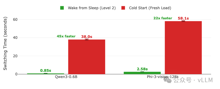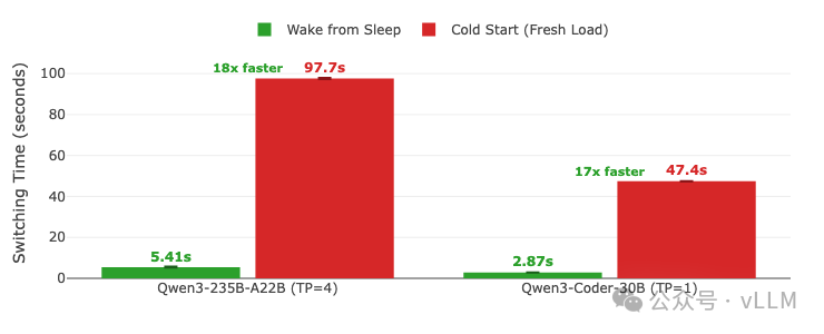 vLLM睡眠模式将多模型GPU服务从30-100秒的重载惩罚转变为亚秒级切换。基准测试本身就说明了一切: