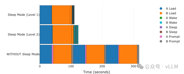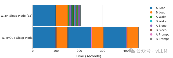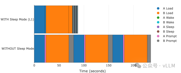 睡眠模式最显著的优势体现在模型切换时间上。唤醒休眠模型比加载全新的vLLM实例快18-20倍。