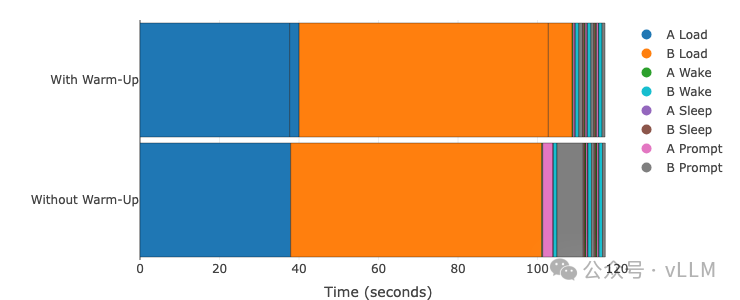 模型A: Qwen3-0.6B | 模型B: Phi-3-vision-128k-instruct GPU: A100 (TP=1) | vLLM 0.11.0 | 睡眠级别:1 | 编译模式:cudagraph_mode: FULL_AND_PIECEWISE对比有预热(预编译)vs 无预热(延迟编译)。悬停查看精确时间。