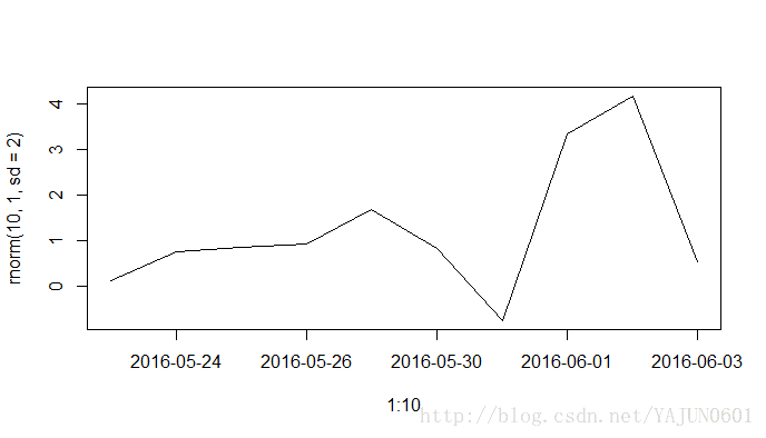 > plot(x=1:10, y=rnorm(10,1,sd = 2), type = 'l',xaxt='n') # 原坐标X 不绘制,否则会重叠