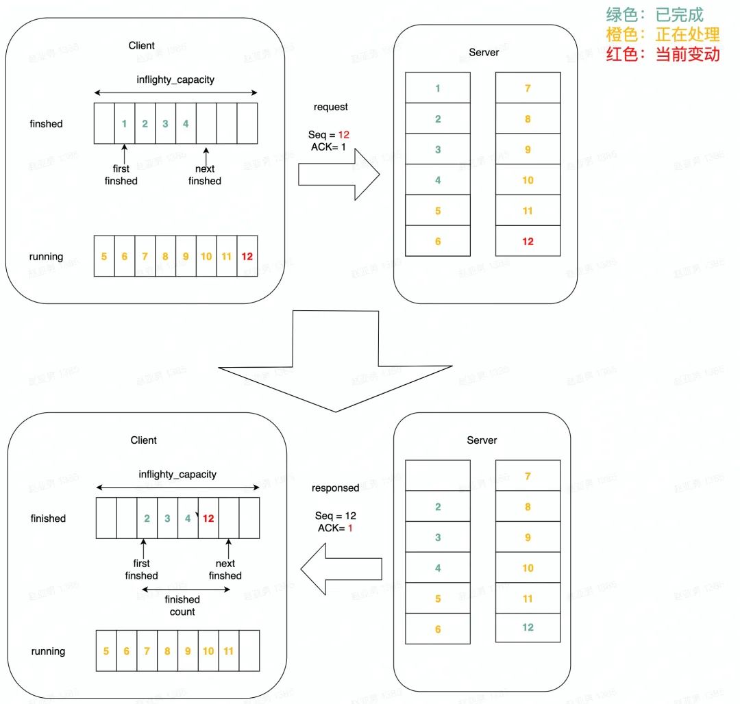 Client 收到了消息的结果,可以确认 Server 已经完成任务,这时候释放 finished 队列中 ACK=1 的项,然后将刚刚完成是 Seq=12 的任务移动到 finished 之中。