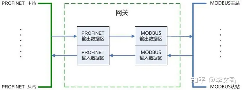 网关分别从 PROFINET 一侧和 MODBUS 一侧读写数据,存入各自的缓冲区,网关内部将缓冲区的数据进行交换,从而实现两边数据的传输。