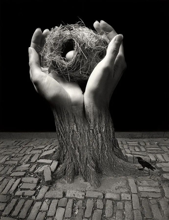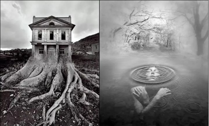 自然规律检验法,观察照片中的事物是否遵循自然规律,那么暗房大师杰瑞•尤斯曼的那种“摄影蒙太奇”风格的作品显然无法过关,比如 2006 年他所拍摄的《走向深夜》,人类的双手从树干中生出,这显然是不可能的。