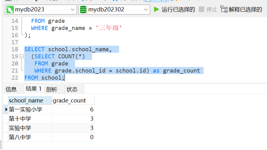 另一个示例是使用子查询和聚合函数检索每个学校的年级数。