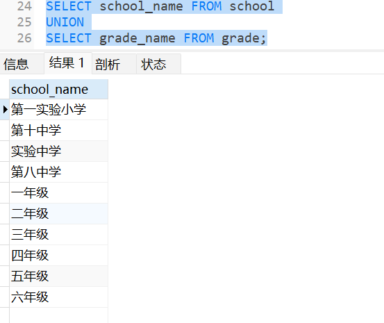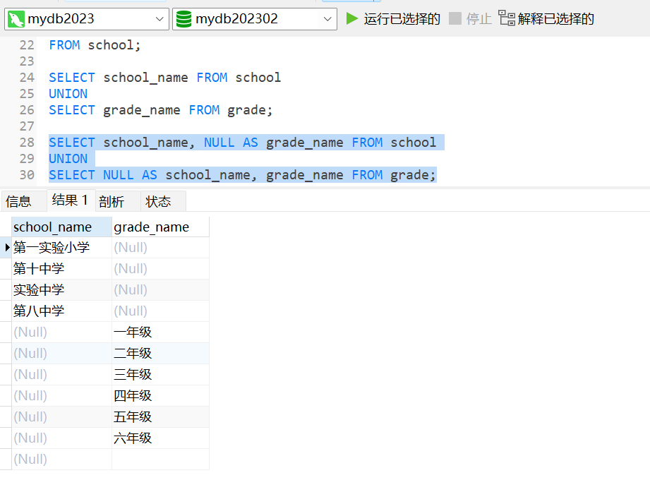 如果要将学校和年级的名称分开,可以使用别名将两个SELECT语句的结果列重命名: