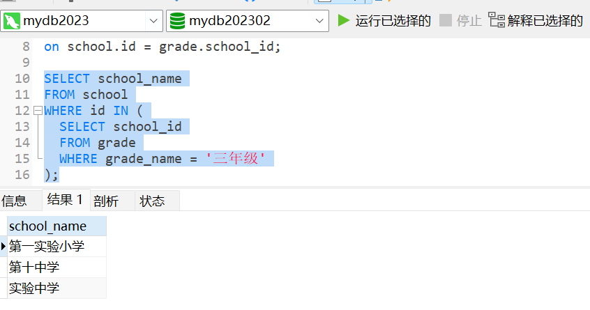 编程目标:以下是一个使用子查询的示例,用于检索包含特定年级名称的学校列表: