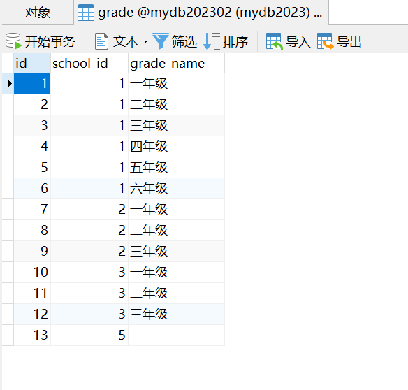 另一个是年级表(grade),包含年级的ID、学校ID和年级名称: