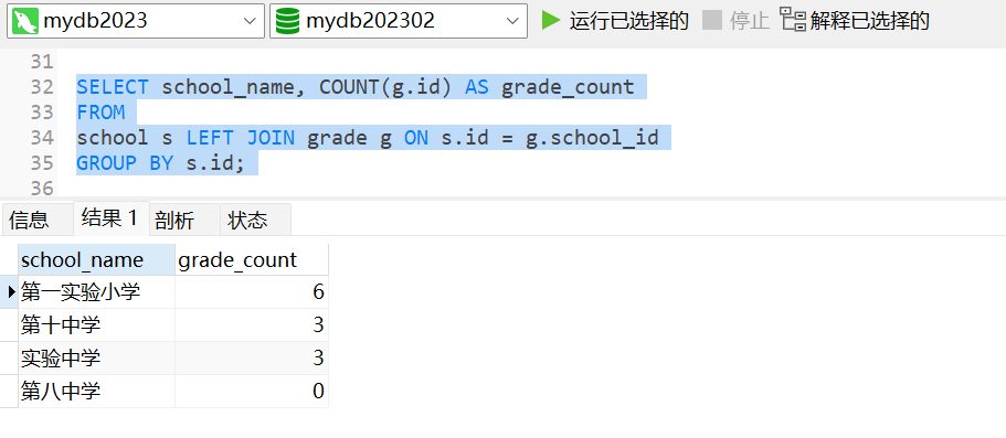 注意,在GROUP BY子句中使用了学校表的ID列,而不是名称列。