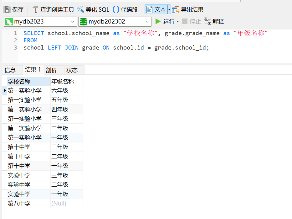 这将返回一个结果集,其中包含所有年级及其所属学校信息,
