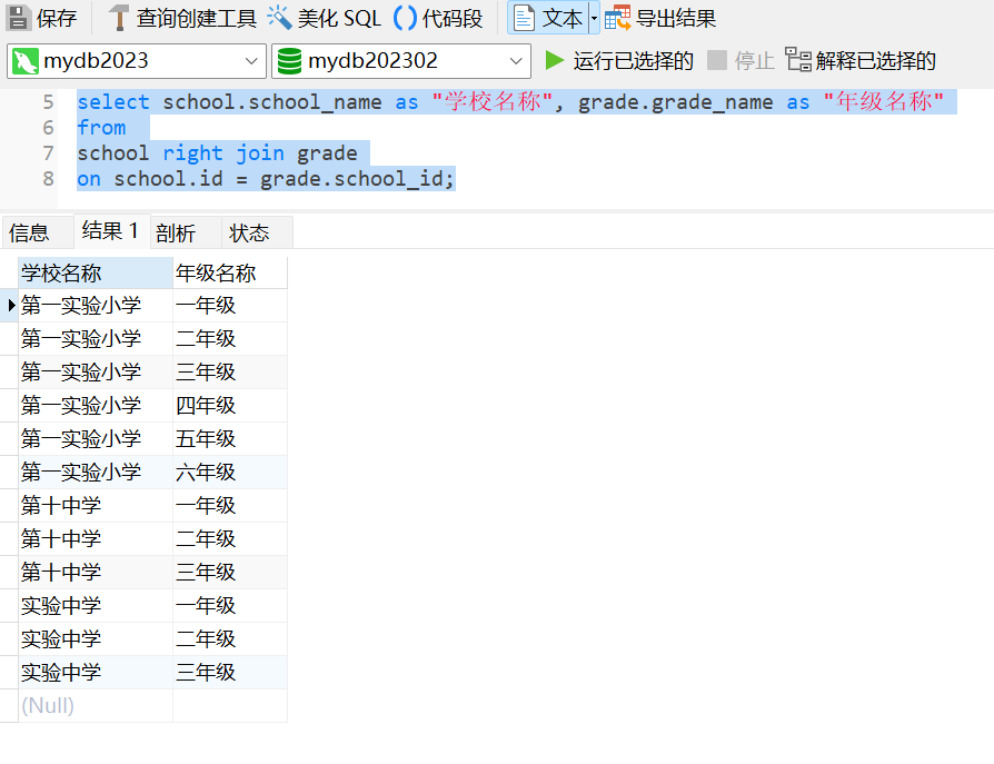 如果年级没有对应的学校信息,则学校名称将显示为NULL。