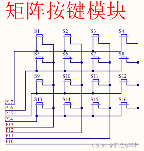 就以逐行扫描为例: 当给P17,P16,P15,P14赋值0111时P17被选中,读取P13,P12,P11,P10的值判断哪个按键被按下。如果S1按下了那么P13就等于0,如果S2按下了那么P12就等于0...