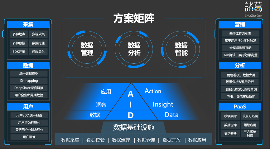 2020年,诸葛公司提出基于客户管理与分析运营的全新DIA服务理念——D,即数据管理平台(Data),以客户为中心的运用数字化帮企业处理 数据的收集、治理、挖掘、激活等过程,实现生意的增长;I,即基于用户全生命周期的数据分析平台(insight),A,则为基于用户旅程的自动化智能营销平台(Action),通过DIA体系,诸葛公司构建了全维度数据服务体系,为客户提供从前期数据采集、整合、激活、管理,到中后期分析、营销、运营转化的一整套数据服务及工具,真正助力企业实现全面数字化转型,提升企业竞争力。