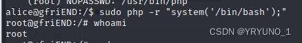 查看用户权限,发现Alice可以不使用root密码就可以运行php脚本,那就可以通过php越权,拿到root用户权限