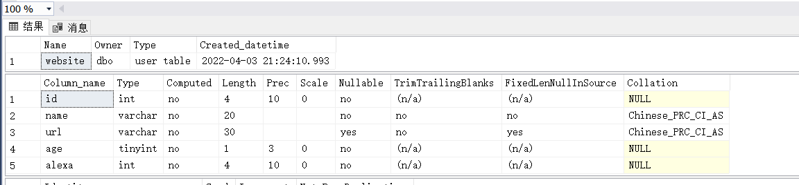 使用SQL Server创建一个表 CREATE TABLE website ( id int NOT NULl, name varchar(20) NOT NULL, url varchar(30), age tinyint NOT NULL, alexa int NOT NULL, PRIMARY KEY (id));--创建一个表sp_help website;--查看表的结构