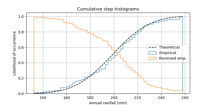 利用python,使用直方图绘制累积分布图 import numpy as npimport matplotlib.pyplot as plt%config InlineBackend.figure_format = 'retina'np.random.seed(190801)mu = 200sigma = 25n_bins = 50x = np.random.normal(mu, sigma, size=100)fig, ax = plt.subplots(figsize=(8, 4))# plot the cumulat