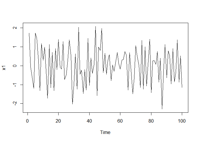 r语言拟合MA模型,及时序图,自相关图,偏自相关图 e<-rnorm(100)x1<-filter(e,filter = c(1,-0.5),method = "convolution",circular = T)plot(x1)acf(x1)pacf(x1)