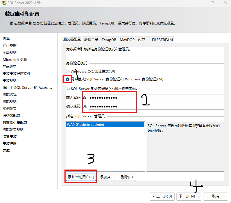 点击混合模式,再输一下密码,然后点击添加当前用户,随后点击下一步: