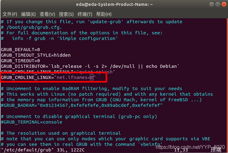 修改GRUB_CMDLINE_LINUX选项为GRUB_CMDLINE_LINUX="net.ifnames=0"(若无此项则新增此行)