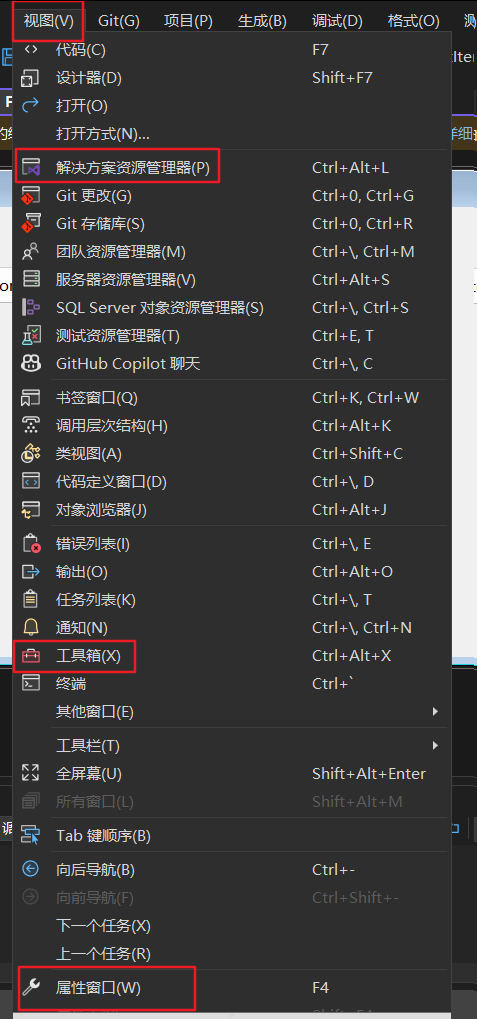 2.打开 visual studio,创建项目,如果在页面上找不到属性、解决方案资源管理器、工具箱