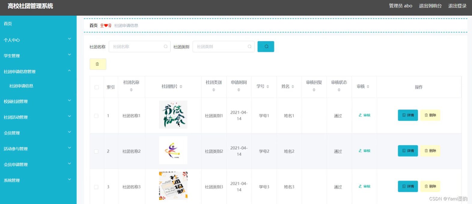 管理员对社团申请信息管理进行查看社团名称、社团图片、社团类别、申请时间、学号、姓名、审核回复、审核状态、审核等信息并可以进行详情、删除操作。