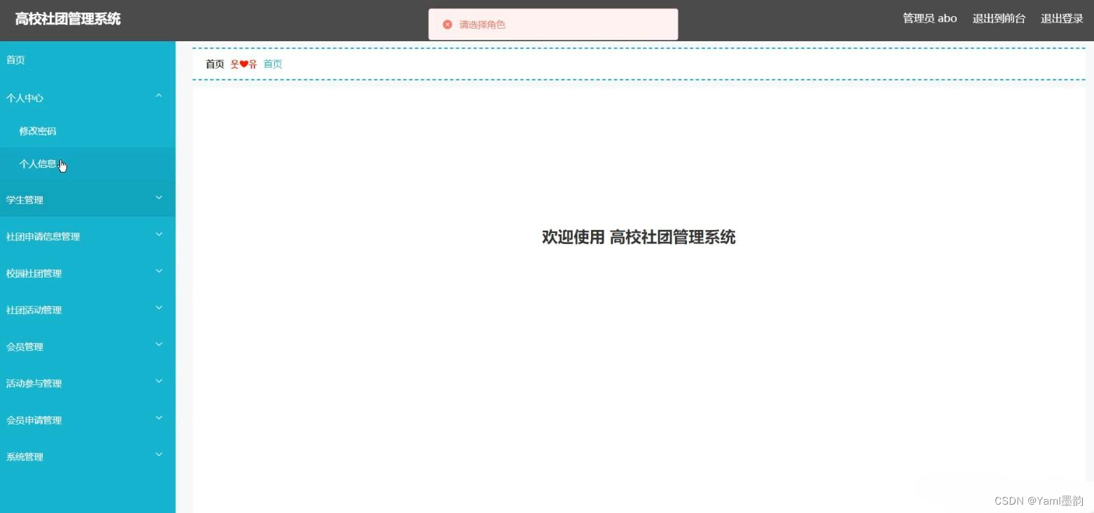 管理员在高校社团管理系统页面可以查看首页、个人中心、学生管理、社团申请信息管理、校园社团管理、社团活动管理、会员管理、活动参与管理、会员申请管理、系统管理等。