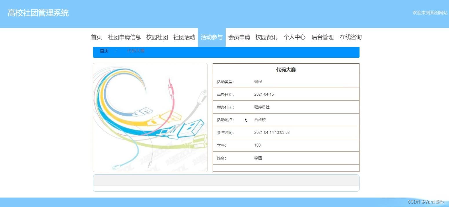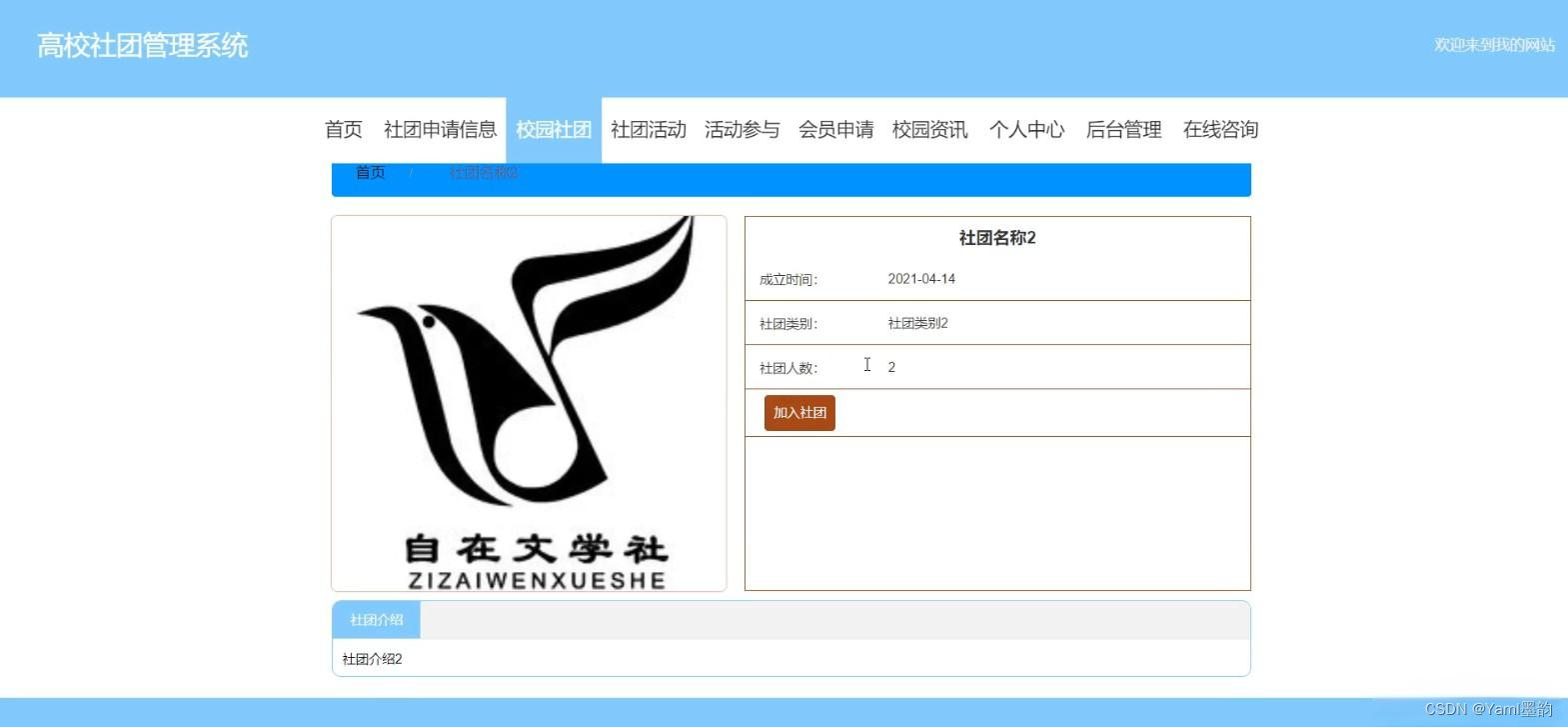 学生在高校社团管理系统页面可以查看首页、社团申请信息、校园社团、社团活动、活动参与、会员申请、校园资讯、个人中心、后台管理、在线资讯等功能。