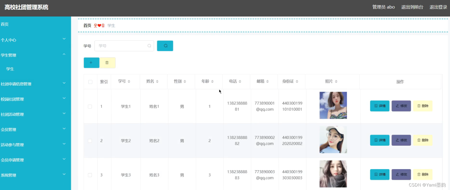 管理员对学生管理进行查看学号、姓名、性别、年龄、电话、邮箱、身份证、照片等信息并可以进行详情、删除、修改操作。
