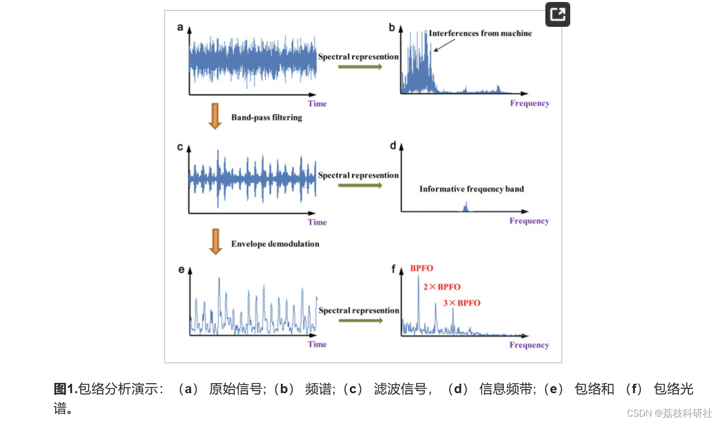 滚动体轴承是旋转机械的关键部件。在许多情况下,它以高速、重负载和长时间运行。因此,接触表面上可能会产生点蚀、剥落、微动、划伤等局部缺陷。这些故障会导致异常振动,从而降低工作精度,甚至造成灾难性事故[1,2]。因此,尽早发现轴承故障是机械维护的一个重要和有意义的课题。近几十年来,基于振动的滚动轴承诊断得到了有趣的研究[3]。当轴承旋转时,故障引起的脉冲将以特定频率重复出现,该频率由缺陷的位置决定。通常,它们的持续时间很短,由于机器的背景噪声,它们的响应很难在时间波形或频谱中直接识别[4]。幸运的是,这些重复瞬变通过系统在更高频段的共振而激发,从而放大并保留故障信息[5]。这意味着对谐振频率周围的振动信号进行带通滤波可以提取故障特征并消除干扰。这种方法通常称为高频共振技术或包络分析,如图1所示。因此,包络分析中最关键的挑战是信息频带(IFB)选择[6],近年来引起了大量关注[7,8,9,10,11]。