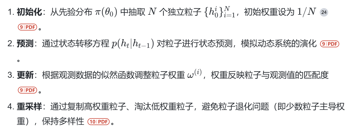 粒子滤波是一种基于贝叶斯递归和蒙特卡洛采样的非线性滤波方法,其核心流程包括以下步骤: