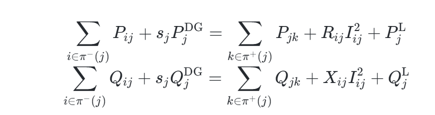 采用DistFlow模型(二阶锥松弛),满足节点功率平衡: