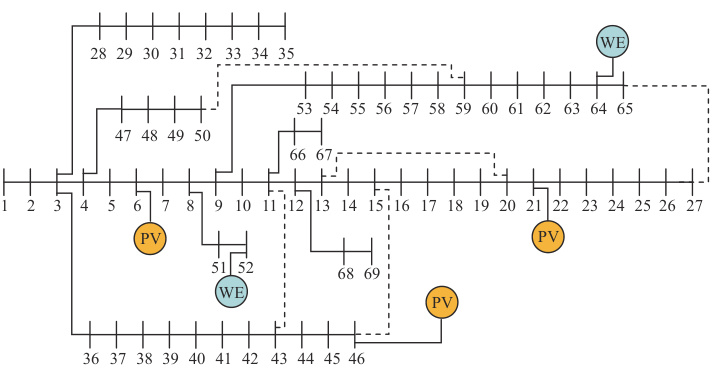 - 区域划分:虚线框标示子区域,便于分区优化;含PV(光伏)、WE(风电)节点,需针对性配置DG。