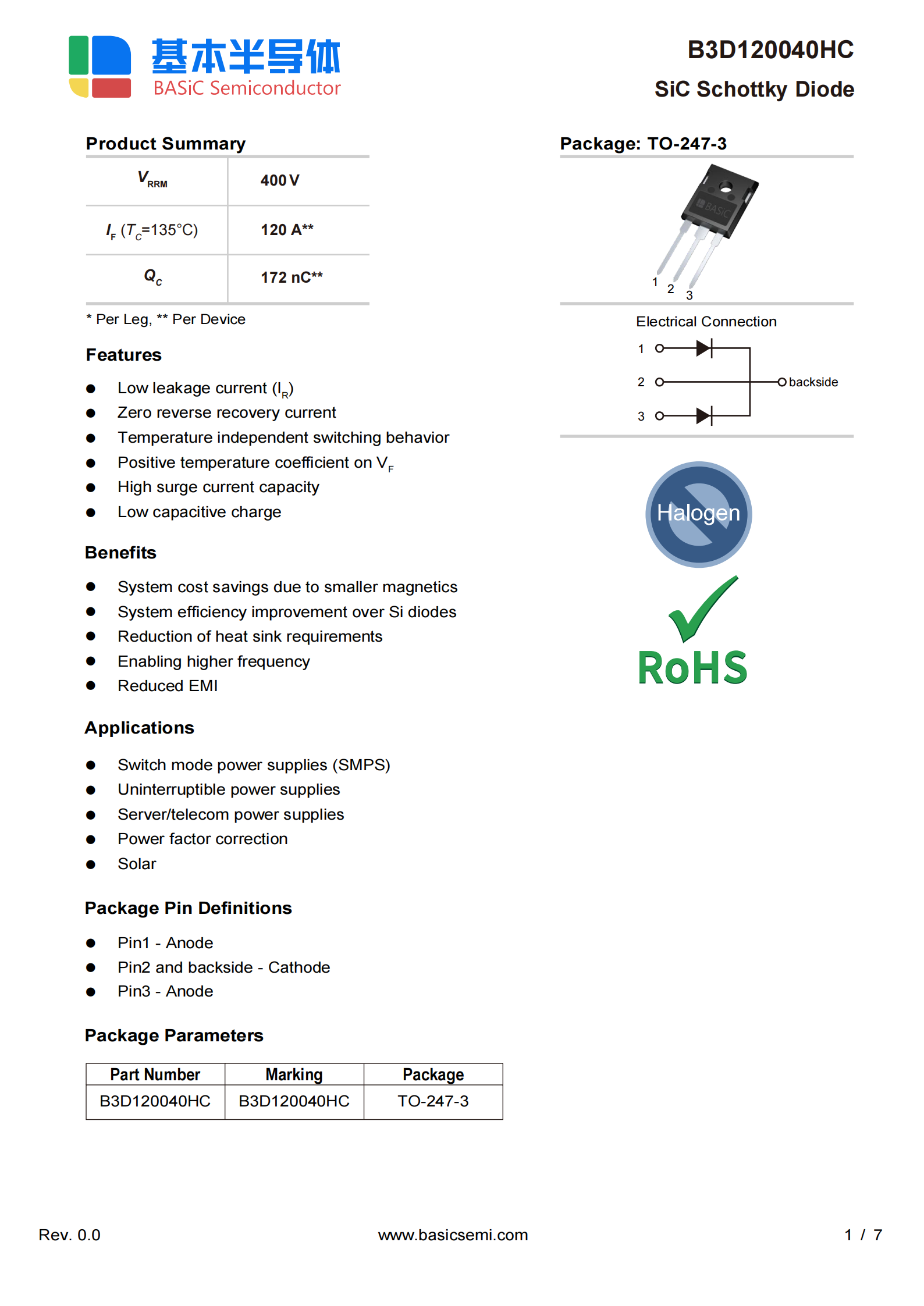 随着电力电子技术向高频化、高效化迈进,碳化硅(SiC)器件凭借其优异的物理特性,正在逐步取代传统硅基器件。在逆变焊机领域,输出整流环节的效率与可靠性直接影响整机性能。BASiC Semiconductor基本半导体推出的国内首款400V SiC肖特基二极管B3D120040HC,以其卓越的电气性能和热管理能力,为焊机设计者提供了全新的解决方案。