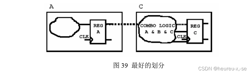 关于dc综合问题 可以通过把与非门吸收到 C 中的组合逻辑的方法消除粘滞逻辑(如下图), 从而使得电路的顶层模块仅仅是将子模块拼接在一起, 而没有独立的电路结构, 这样的一个另一个好处是可以使得在至下而上的设计策略中不需要编译顶层模块。在这张图里, 组合逻辑被划到了 C 模块中, 它不仅能保证组合的最佳优化还能保证时序的最佳优化, 因为里面的寄存器在优化的过程中可以吸收前面的组合逻辑, 从而形成其他形式的时序元件, 如由原先的 D 触发器变成 JK 触发器、 T 触发器、 带时钟使能端的触发器等等。