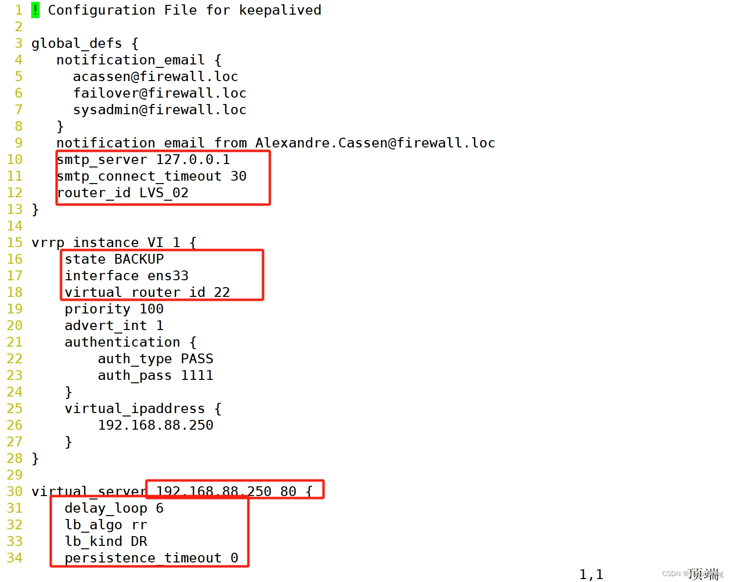 virtual_server 192.168.88.250 80      #36行修改,指定虚拟服务器地址(VIP)、端口