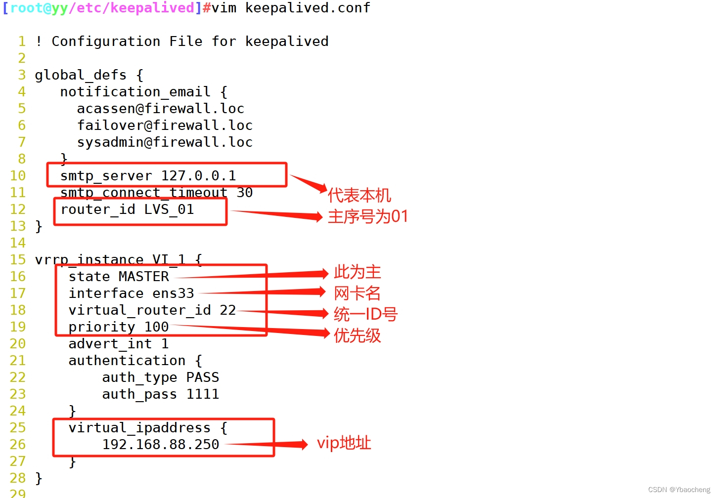 interface ens33                       #21行修改,指定承载vip地址的物理接口