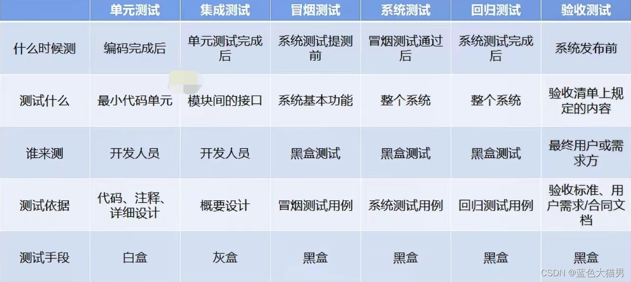 常见测试模型 主要特点是将测试过程细化,分为了单元测试、集成测试、系统测试和验收测试四个不同的阶段、但是仍然是测试后置、没有解决风险问题。> 将测试和开发过程分离出来,对整个项目过程中的需求文档、设计文档同样要进行测试。敏捷模型主要的特点是为了适应现代互联网公司的"短频快"的开发节奏而设计的一种测试和开发的模型。> 最大的问题是测试工作后置,导致整个项目开发完成之后入如果发现比较重要的问题,修改的成本是非常巨大的。5.V模型是瀑布模型的变种,瀑布模型存在的问题V模型也存在。:验证,针对过程的正确(正确的做事情)