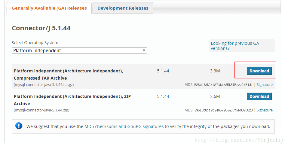 点击链接Connector/J 5.1.44下载至本地主机,然后再传至