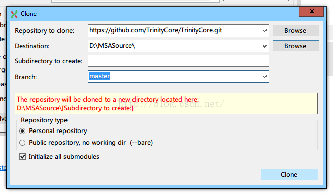点击Clone。这会将TrinityCore于Github的源代码拉取至你的本地文件夹中,时间取决于你的网络连接速度。