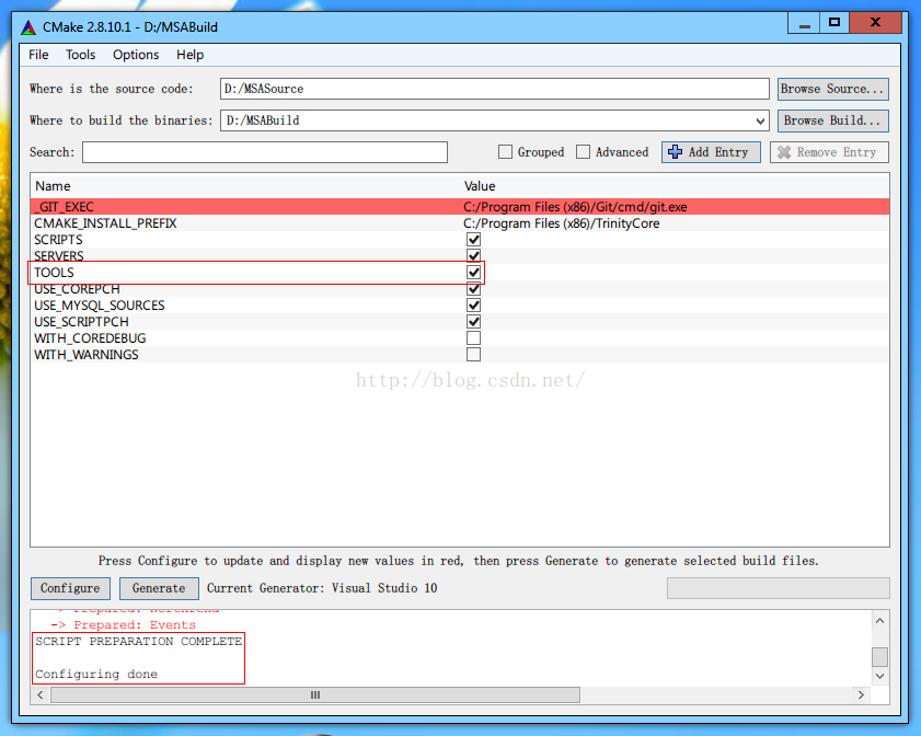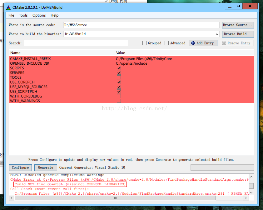 3. 生成Visual Studio解决方案,将源代码通过CMAKE转化为可用VS2010或其他版本可用的解决方案。如果你的机器上没有相应的运行环境,则必须首先配置——至少要安装PERL5和OPENSSL,在某些情况下可能还需要MASM或NASM。这个过程非常容易出错而且对于经验不足的开发者很容易就此卡壳,我会在此介绍我所了解的问题的解决方法,但不承诺为你提供后续的帮助支持。