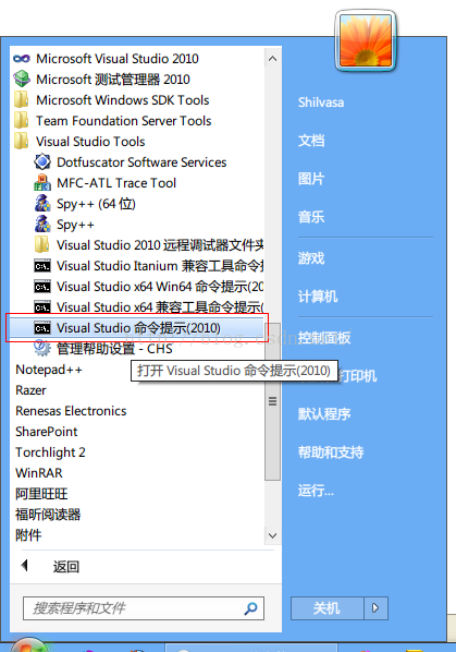 如果你正确安装了VS2010,可以在开始菜单找到含有所需编译配置的Visual Studio命令行工具,点击打开。