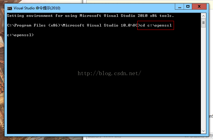工具需要几秒钟的配置时间,等待至可以输入文字时,定位至OpenSSL所在目录。我的是C:\openssl,所以我就输入: