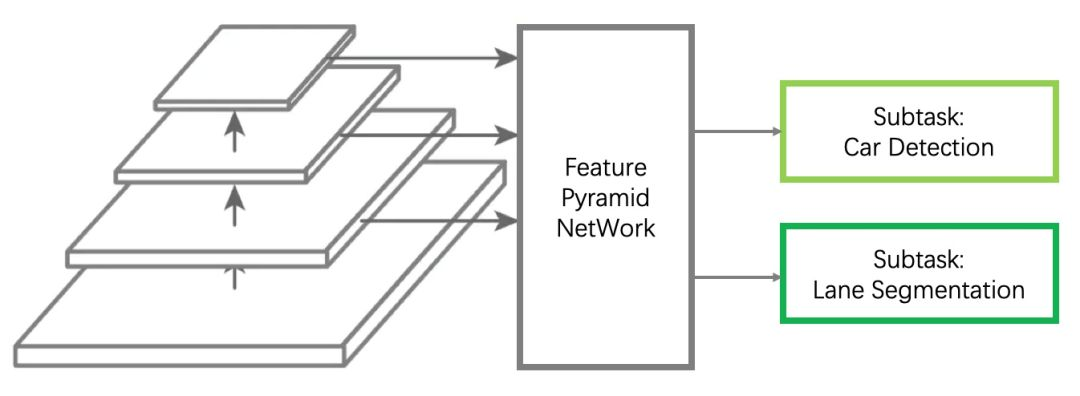 由于交通图像中车辆和车道线有一定的相关性 (车辆一般情况在两条车道线中间),为了充分的利用深度学习网络能力,共用网络主干部分提取到的图像特征,我们设计了一个高效的多任务网络(图2所示),单个模型完成车辆检测、车道线检测任务和其他任务,并在此基础上,实现了一套多任务权重自学习的机制,保证各个任务高效充分的学习,最终使得多任务学习模型达到独立单任务模型持平的识别效果,部分任务甚至略有超出。