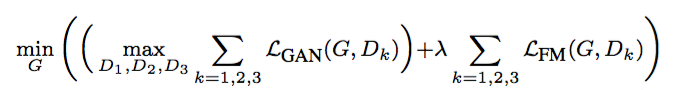 判别器使用多尺度判别器,在三个不同的尺度上进行判别并对结果取平均。判别的三个尺度为:原图,原图的1/2降采样,原图的1/4降采样(实际做法为在不同尺度的特征图上进行判别,而非对原图进行降采样)。显然,越粗糙的尺度感受野越大,越关注全局一致性。
